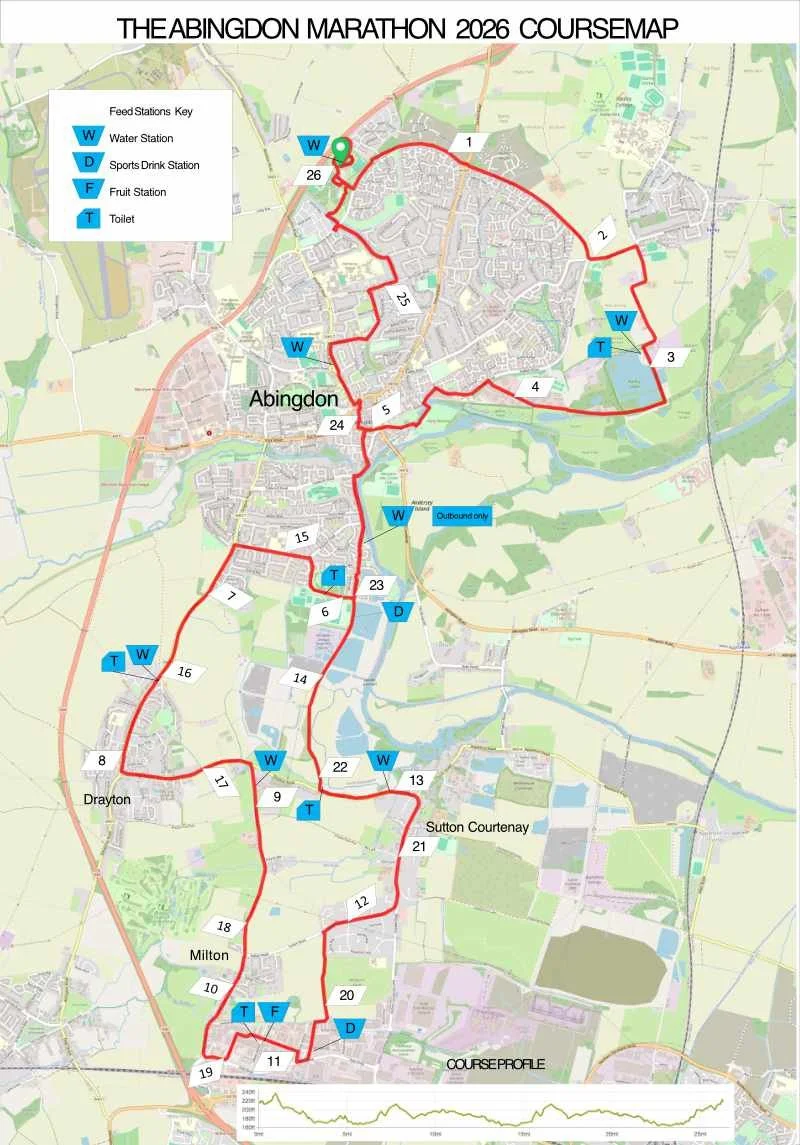 The route passes through the town centre, heading out on a two-lap course, passing through the picturesque villages of Drayton, Milton, and Sutton Courtenay. Runners then head back through Abingdon to Tilsley Park, finishing on the track in front of the grandstand.